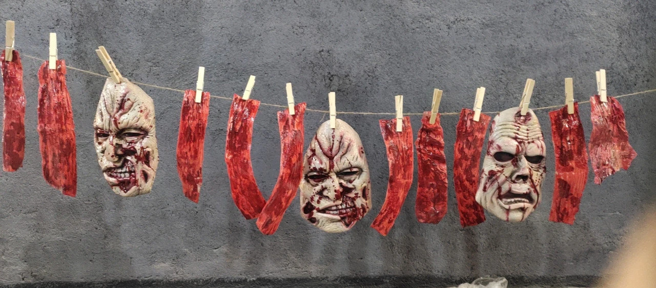 Comes with all 15 pins and 10 pieces of Flesh and 3 human faces all gored up and ready to hang with a 10ft rope.