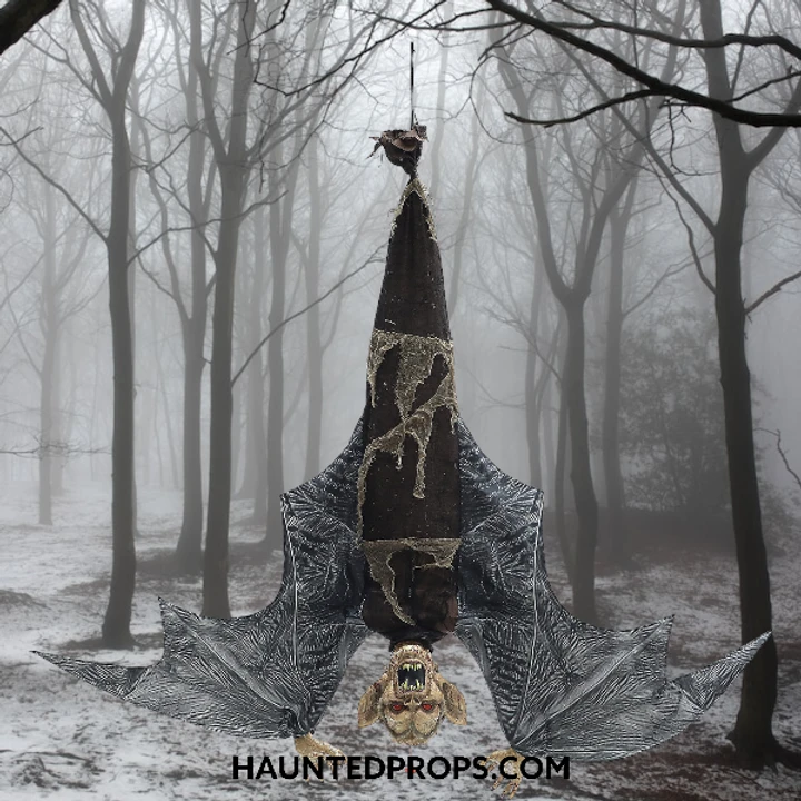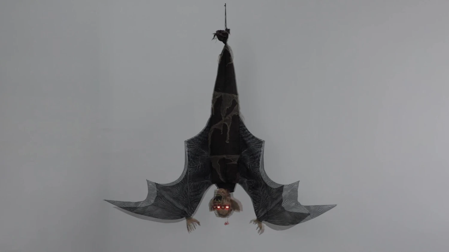 Menacing Hanging Bat Prop makes grating schrieking noises while his head with glowing red LED eyes turns side to side looking for his next victim! Wings move gently back and forth as he sways in the breeze. Requires 3 AA BaRequires 3 AA Batteries, not included. Hangs easily anywhere you want to add a scary accent!