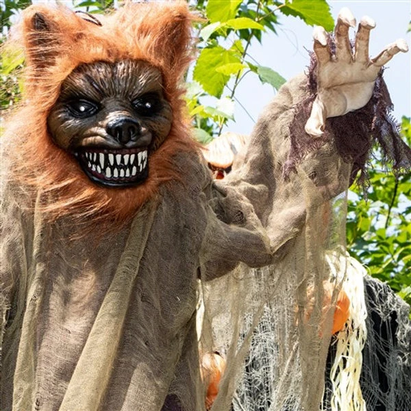 . These blood-curdling creatures are sure to terrify any trick-or-treaters, coworkers, or customers. Full moon or not, Howler the Werewolf is on the prowl this Halloween. This horrifying wolf-man will petrify visitors with his flashing green eyes, moving upper body, eerie music, and of course, hunger-filled howling and growling. One glance at Howler is enough to send guests running. His werewolf head, toothy, monstrous smile, and furry, human-like feet are a sinister sight to behold. Battery operated with poseable arms, he includes a stand and an optional hanging loop at the top of his head so you can display him however and wherever you want. Place him on the front porch to greet visitors or in your living room to complement the rest of your spooky decor. For longer prop life, we recommend indoor or sheltered outdoor use protected from inclement weather. For thrills and chills so frightening that your neighbors will run shrieking in horrendous delight, count on Halloween decorations from Haunted Hill Farm