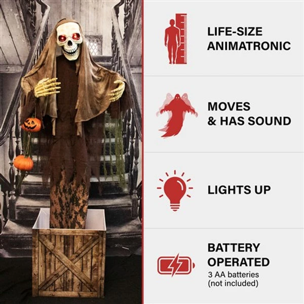 - Battery-operated animatronic for convenient placement anywhere inside your home – no wires to trip over (3 AA batteries not included)