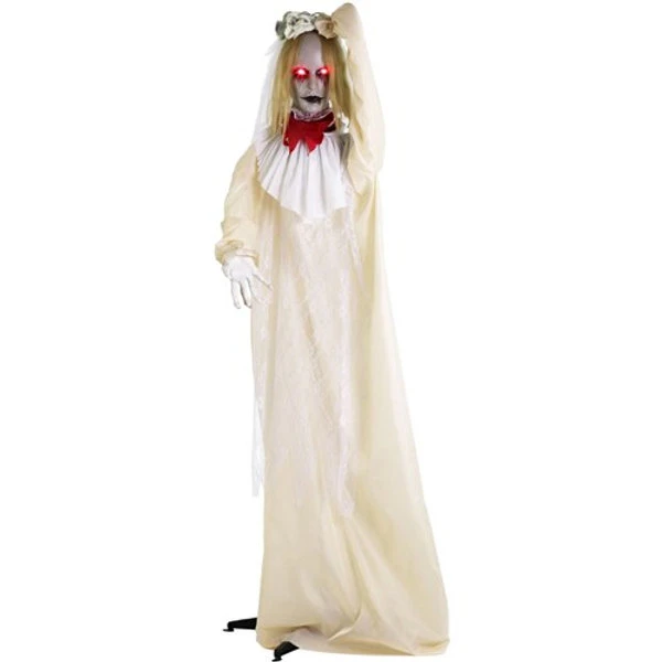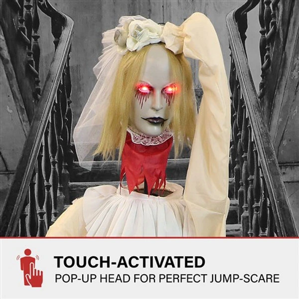 Enter, if you dare, into the horrifying world of Be afraid. Be very afraid of our Cursed Wedding Collection. These heartbroken brides and grooms are just what you need to turn your home into the scariest house on the block. Poppy, the animatronic runaway bride, anxiously awaits the arrival of any trick-or-treaters who dare knock on your door, so she can spring into action and give them a dreadful jumpscare. When touched or sound approaches, she says, “Boo!” while her head pops up and her red LED eyes glow in the dark with a vengeance.Taunting music and girlish giggling echo in the night as her head slowly retracts back onto her shoulders. Her bloody eyes and black lips contrasted against her ghostly skin will chill all your visitors to the bone. Poppy’s body arrives on your doorstep fully assembled, along with an easy-to-assemble stand. Drape her over her sturdy stand or use the hanging loop on top of her head to hang from a tree, porch, overhang, or ceiling. One bendable arm allows you to pose this zombie bride in different scary positions. For a convenient display with no messy wires to fuss with, this vision of ghoulishness operates on 4 AA alkaline batteries (not included). Be the wicked one this season and bring this animated fright prop home to scare your family, friends, and neighbors. You’ll make a scene this Halloween to impress all your ghoulish guests with Poppy the Zombie Bride from Haunted Hill FarmPRODUCT FEATURES:Make a scene this Halloween with the Cursed Wedding Collection by Haunted Hill FarmGive all those who dare knock on your door – friends, family, neighbors, trick-or-treaters – the perfect jumpscareBattery-operated animatronic for convenient placement anywhere inside your home – no wires to trip over (4 AA batteries not included) – Multi