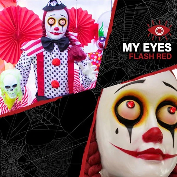 . These blood-curdling creatures will terrify trick-or-treaters, coworkers, or customers. This clown lady may not say much, but she doesn’t need to. Visitors will shrink with fear when they lay eyes on this sinister yet sad mime clown. Her eyes flash a fearsome red as she performs in the night. Dressed in a festive clown costume complete with polka dots, stripes, and a hat, one might mistake her as friendly until they see the skull she clutches in her eerily human-like hands. Bend her arms into various frightening positions to keep the scares coming all night. Battery operated, she includes a stand and an optional hanging loop at the top of her head so you can display her however and wherever you want. Place her on the front porch to greet visitors or in your living room to complement the rest of your spooky decor. For longer prop life, we recommend indoor or sheltered outdoor use protected from inclement weather. For thrills and chills so frightening that your neighbors will run shrieking in horrendous delight, count on Halloween decorations from Haunted Hill Farm