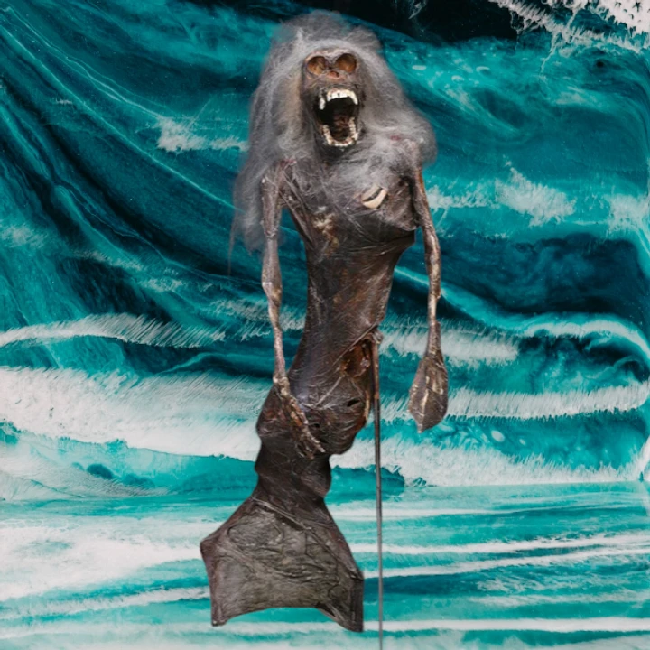 This is a life-like recreation of the worlds largest feegee mermaid. Articulated arms and tail fin. Comes with rolling stand.