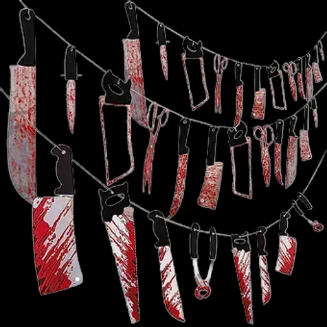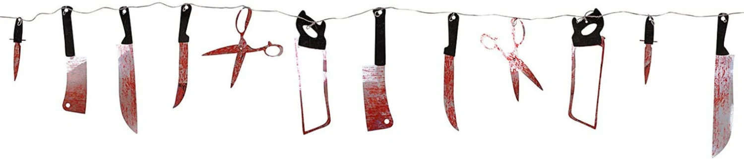- VARIETY OF CLASSIC HORROR TOOLS – Included in this paper garland are some blood splattered horror prop classics, such as a butcher knife, hacksaw, and scissors!