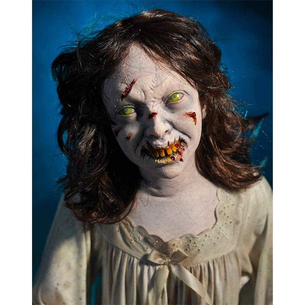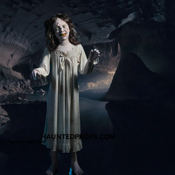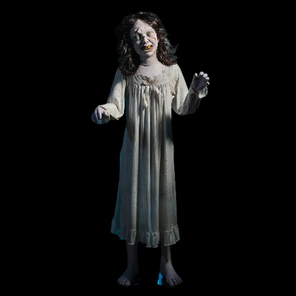Affliction is a 4.5 ft. tall standing Halloween prop is an amazingly eerie demon possessed girl with disturbing smile. Crafted of latex, armature and foam filled, this is a perfect static prop for your yard haunt, home Halloween decorating, haunted house, or scary scene.Â