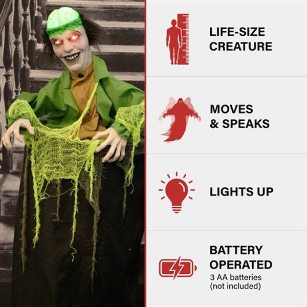 - Touch Activated: This touch-activated animatronic is eager to greet your visitors with a jumpscare. His head and arms swing back and forth, his brain glows green, and his eyes glow red. Spine-chilling sound effects include moaning and groaning.