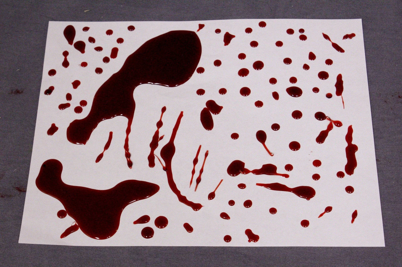A collection of mainly single drop blood pools, and a few very small pools, and long drips. Drops will come on a 10″ x 7″ sheet.