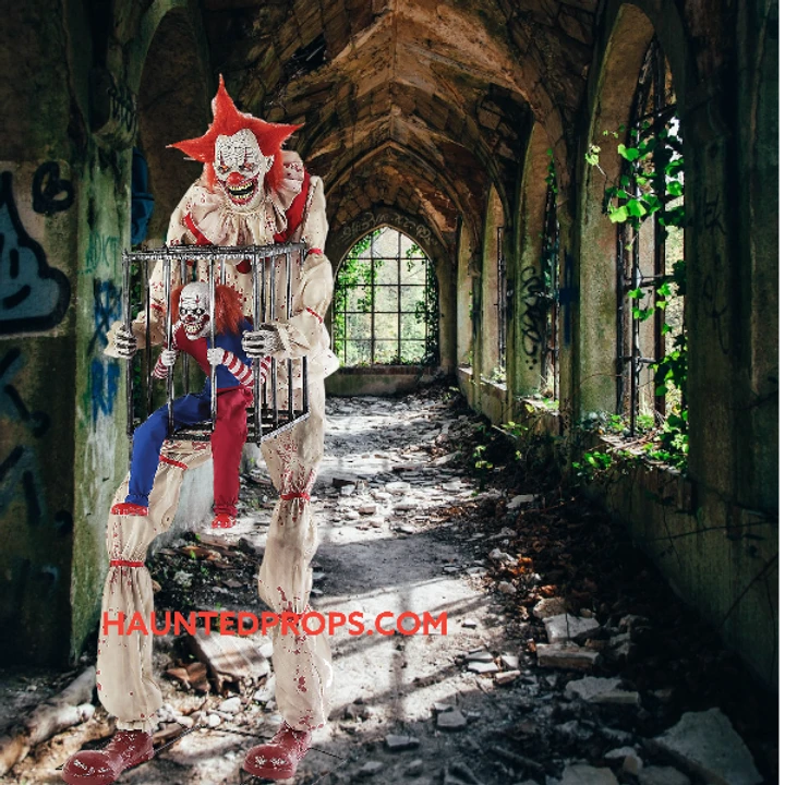 If you werem’t afraid of clowns before this guy might do the trick: Cagey the Clown With Clown Animated Prop! This intimidating 7-foot tall animated Buffoon wears a dirty old Clown costume with red accents and large burgundy clown shoes! Cagey is holding a large cage with a small laughing clown inside – he just loves laughing and playing with clowns! Once activated, Cagey the Clown’s eyes will glow with otherworldly glee and his head and torso turns side-to-side while he says one of 6 scary sayings while the little clown laughs and rocks back and forth! Plug the UL power adapter into any standard outlet and choose from Steady-On, Infra-Red Sensor, or Step Here Pad (included) activation options. The infra-red sensor works up to 6.5 feet away and works in all lighting conditions – bright light to no light! Item includes volume control. Easy-to-assemble quick-connect poles. Assembly required. Indoor or covered-porch use only.
