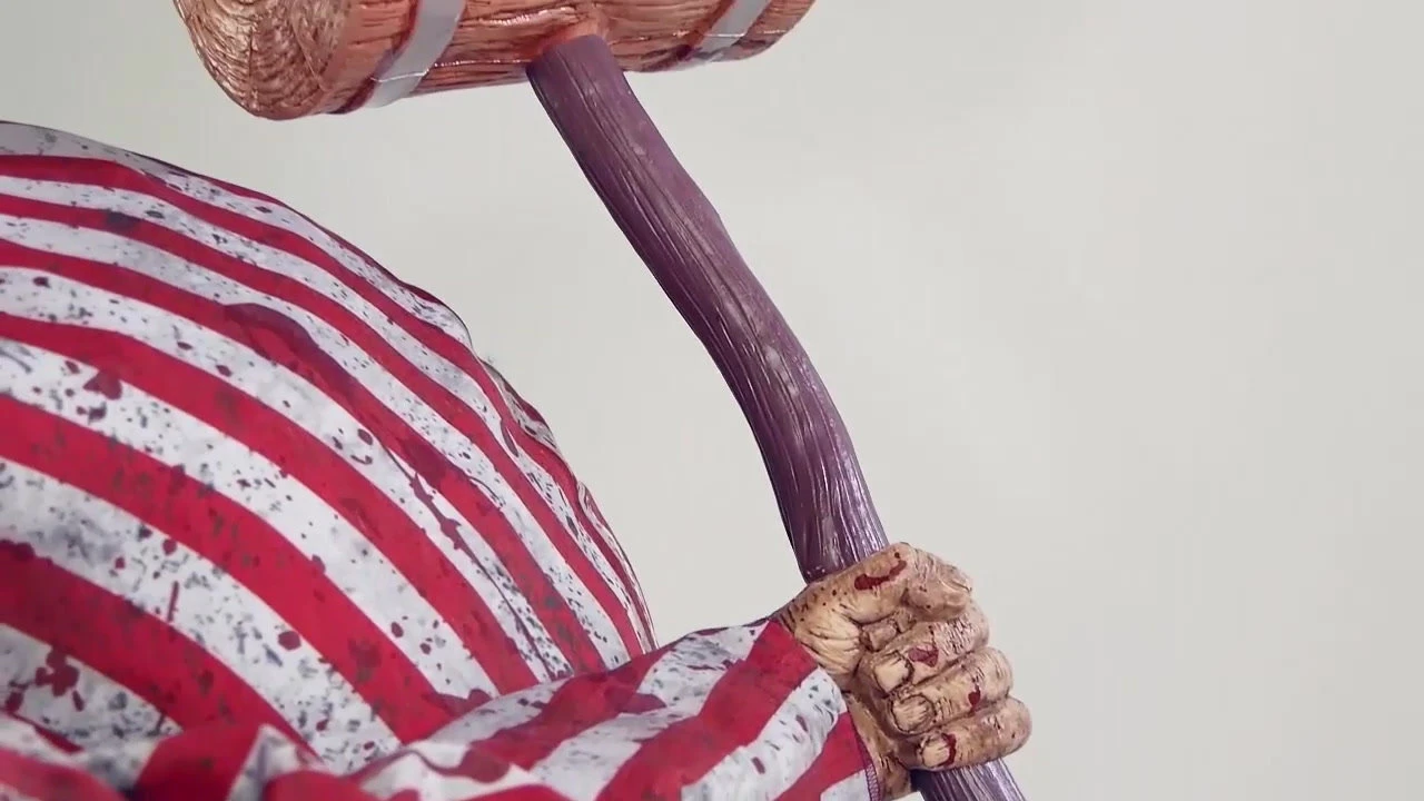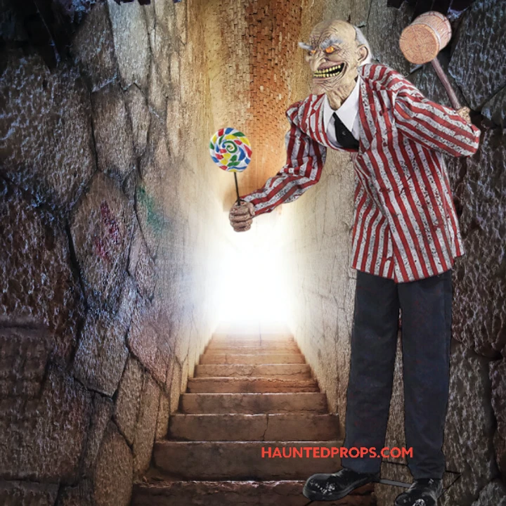 The Candy Creep Animated Halloween prop is a life-sized Sinister hump-backed Old Man with short gray hair and matching bushy eyebrows wearing a blood-spattered red & white striped carnival jacket, stained dingy white-collared shirt with black tie, black pants, and black shoes. This Creepy Carnival Guy is bending over and offering a large Colorful Lollipop to unsuspecting children while behind his back is a large Bloody faux-wood Mallet! His strange yellow Light-up Eyes and Moving Jaw saying 5 phrases draws your attention, and his Torso Rocks side to side, looking for his next victim! Easy Assembly and Convenient Activation options includes a Step Here Pad. Best Haunted House Decoration for your next Halloween party! Your gathering will be the most talked about event in the neighborhood!