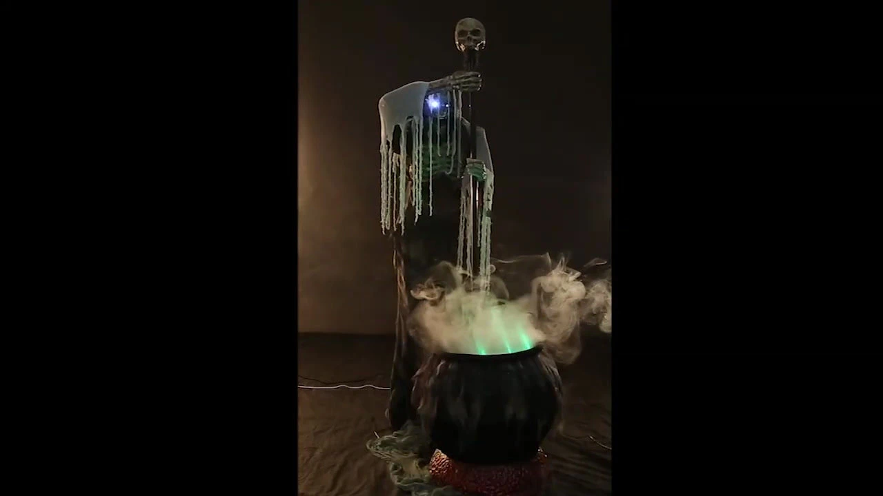 The Cauldron Creeper! Wearing a tattered costume with long shredded-gauze accents this disgusting 72 inches tall anima Cauldron Creeper loves stirring his stew – and wants to have you for dinner! Featuring PVC head with hinged jaw hands and chest with such realistic sculpted details you have to see to believe he’s not real – truely disgusting! Plug the UL power adapter into any standard outlet and choose from Steady-On or Infra-Red Sensor or Step Here Pad (included) activation options to operate. Once activated this rotting corpse’s eyes will glow as his head raises and lowers while he slowly stirs the brew with his long staff topped with a rotting plastic skull in his glowing green cauldron and the burning embers beneath it glow with heat while saying one of three sayings ( inches(evil laughter) inches inches the pot, I’ve put me flesh in, now I’ve naught. I’ll let it simmer ’til bubbling brew, and when it’s ready I’ll come find you! He heh heh inches, inchesAh, this is thickening n yessss. Heh heh, this cauldron is full of tasty morsels I have found. Would you like to give it a try? It’s Halloween ANYTHING can happen this night! Heh Hah! inches Attach the optional Fog Hose (included) to your Fog Machine (not included) to add fog coming out of the cauldron to complete the creepy effect. The infra-red sensor works up to 6.5′ feet away & works in all lighting conditions – bright light to no light! Item includes volume control. Easy-to-assemble quick-connect poles. Assembly required. Materials: 40% Iron, 8% PVC, 2% Electronic, 30% Polyester, 20% Cotton