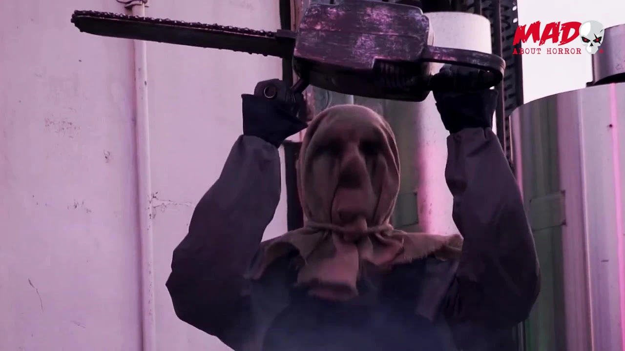 He raises his chainsaw, his head nods wildly, with loud chainsaw sounds and screams