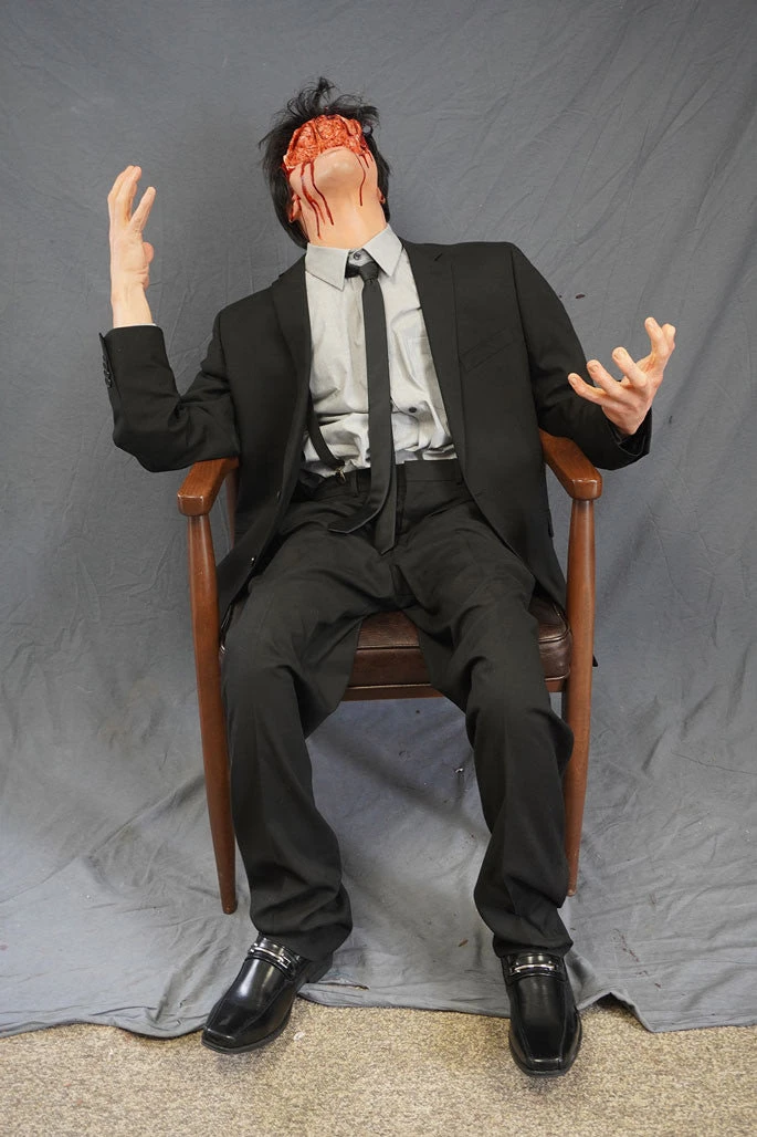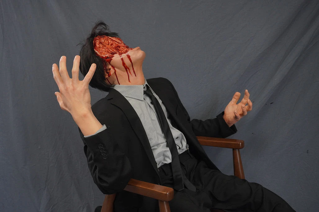 Poseable dummy body with extreme gore Chasm Clark head and lifecast hands.