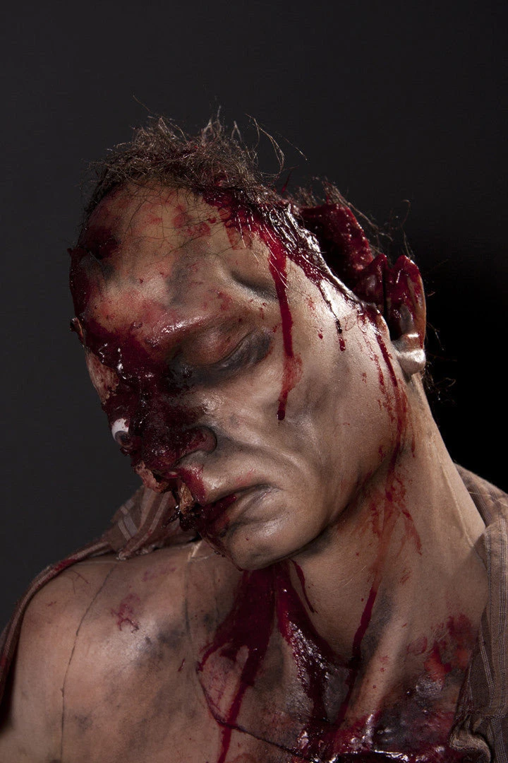 Crowbar Keith Zombie is our shortest male zombie, standing about 5’3,” but he’s a tough little guy. Keith has alread been shot in the head, blowing out the entire back of his skull and exposing part of his face. Armed with a crowbar, he keeps coming. Freestanding prop, lifecast torso on steel leg stand.