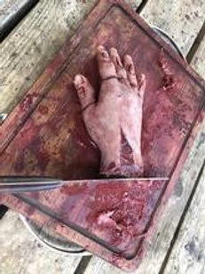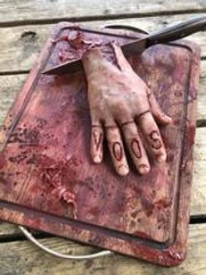 This prop is a severed hand with magnetic fingers that detach mounted on a cutting board with real knife “ dulled down and fastened to board” . This is the perfect addition to your escape room or haunt set. Hand constructed out of silicone this prop is 100 percent water proof. Customize your fingers with tattoos or carving to add your own personal code or clue. Just shoot me a message and let me know what you’d like no extra charge.