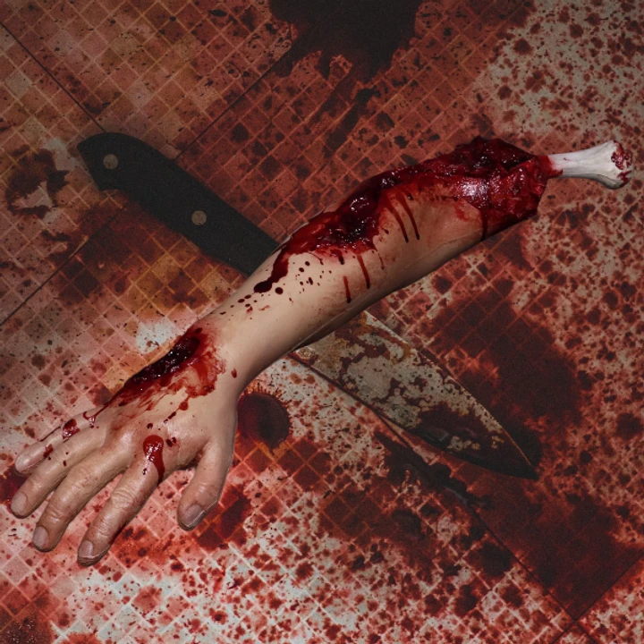 This gory arm prop has an exposed bone at the end.