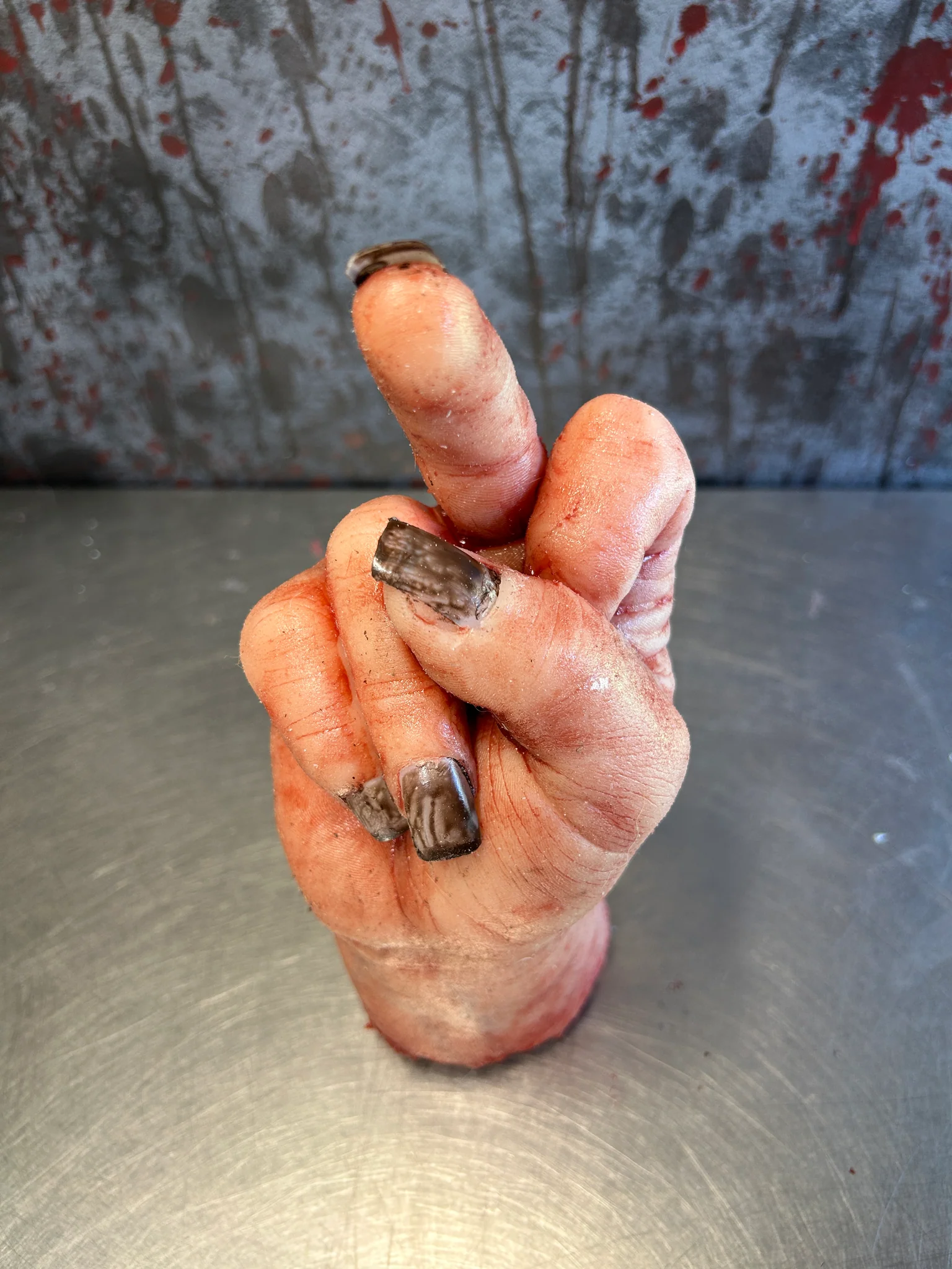 This severed hand is solid silicone and comes with acrylic nails . Highly detailed and individually made this prop is the perfect addition to your collection of oddities. Allow 2 to 3 weeks for production of this item.