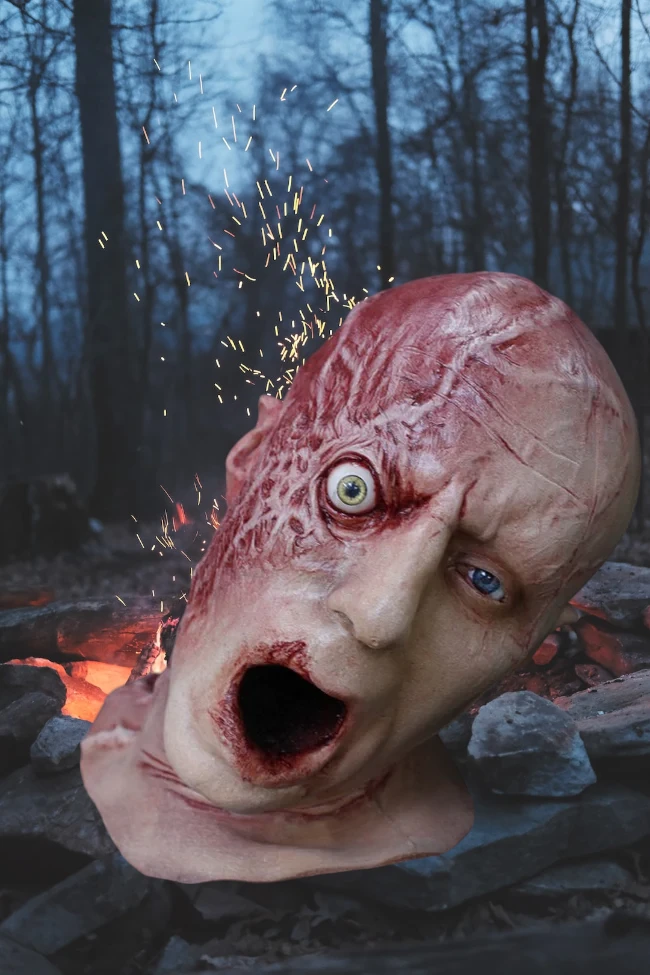 Our Floyd head features one protruding eye and veins on half of its head. The head is turned to the left and the mouth is open.