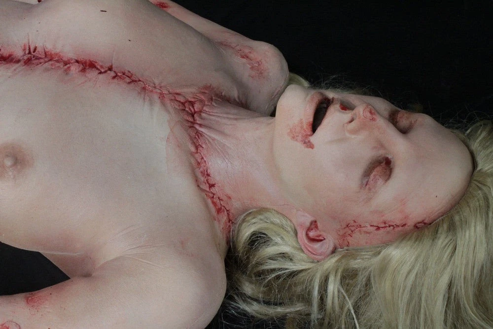 Gory half Meredith with a open mouth, incision cuts and bloody guts spilling from inside.