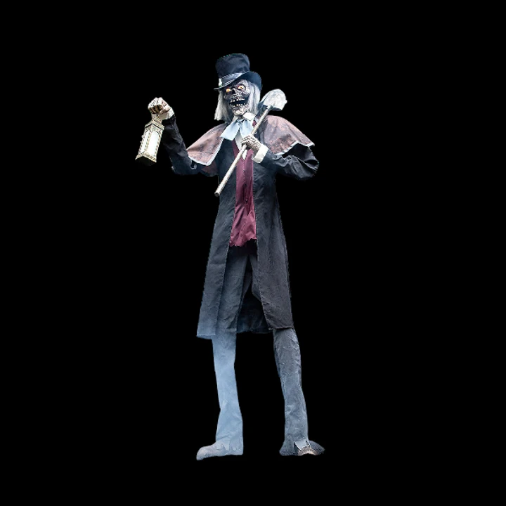 This 8.5-foot Graveyard Host Animated Prop searches around the neighborhood cemetery for his friends! The Graveyard Host is looking to have the best fun this Halloween season or else! Motion sensor activates turning head, moving jaw, light-up eyes and flickering flame lantern. Be sure to invite the Graveyard Host and his dead friends over before he crashes your party for good!