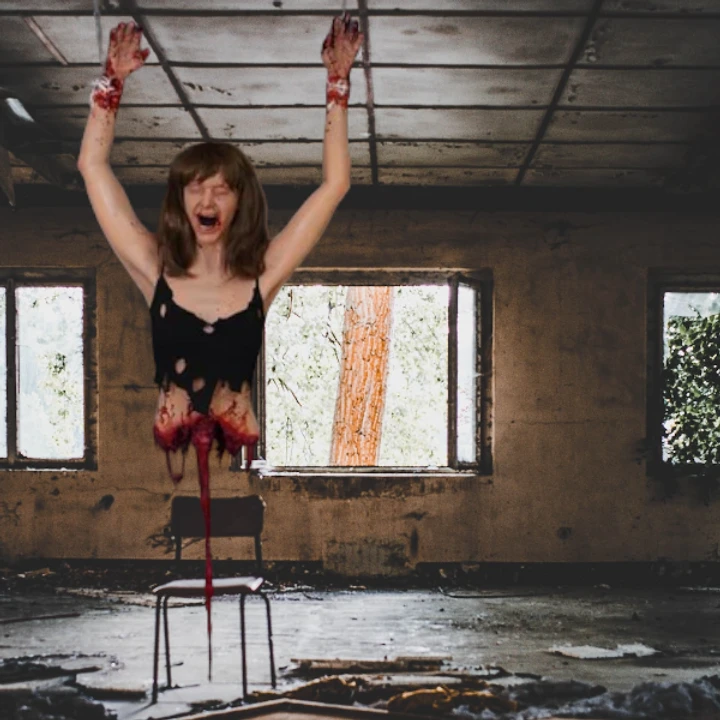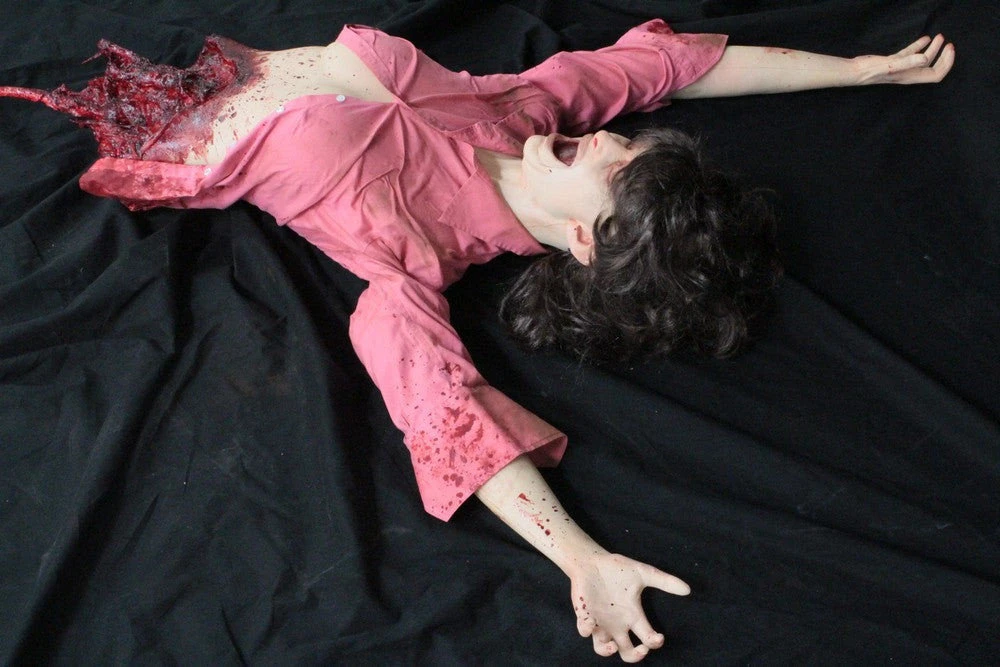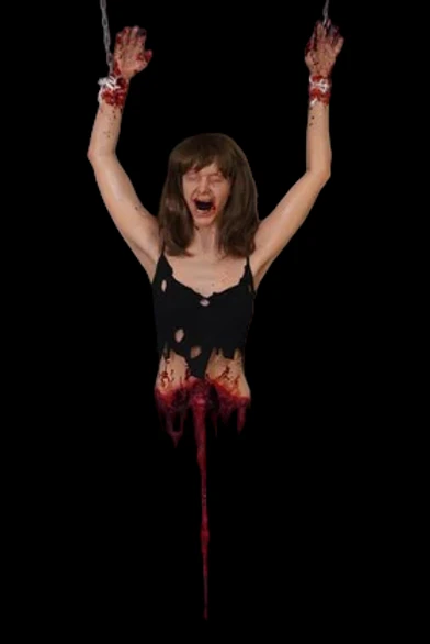 Screaming Agatha with guts spilling from waist and poseable arms. Lots of blood and gore. Hangs from hands.