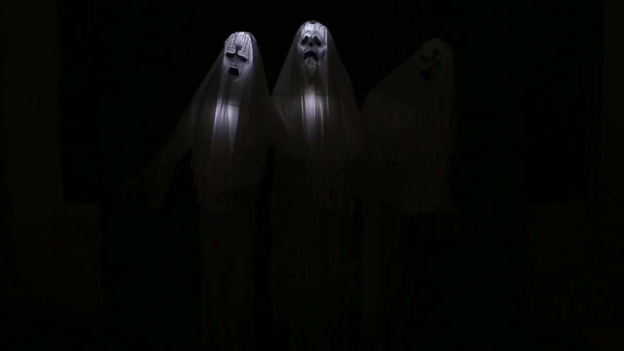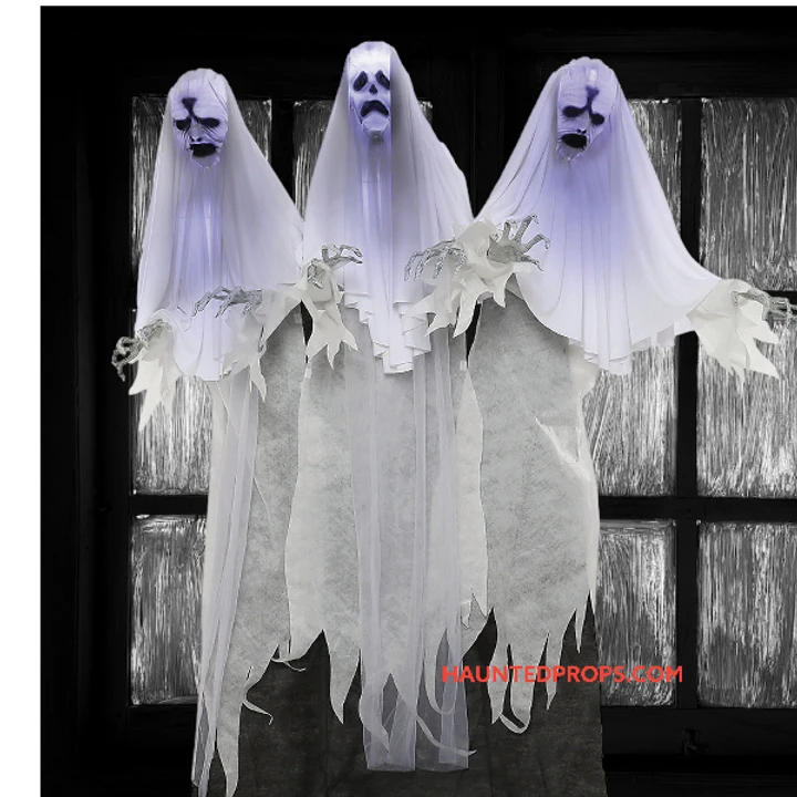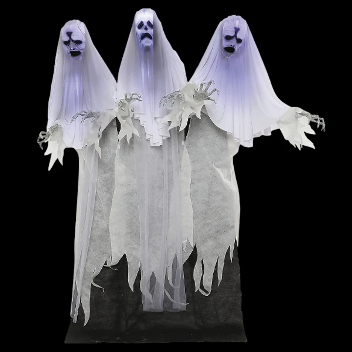 Now you can have a whole gaggle of ghosts at your door or onyour porch with The Haunting Ghost Trio! These three 6 footGhost characters have fabric-covered PVC heads with light-upfaces & torsos, draped white fabric costumes, posable armswith creepy plastic long-fingered hands, and a black fabricdrape to hide the easy-to-assemble frame. Plug in the ULpower adapter into any standard outlet & choose fromSteady-On, Infra-Red Sensor or Step-Here Pad (included)activation options to operate. Once activated, the HauntingGhost Trio will begin moaning as their faces and chestslight up with an other-worldly glow as each Ghost sways fromside to side, wailing in eternal torment! The infra-redsensor works up to 6.5' feet away & works in all lightingconditions - bright light to no light! Item includes volumecontrol. Easy-to-assemble quick-connect poles. Assemblyrequired.