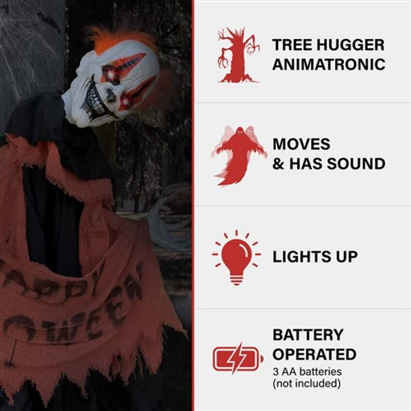 - Fully-assembled fright prop for easy setup – secure Twister the tree hugger to a column or tree with his attached elastic straps (clown will not move if not secured against a solid object)