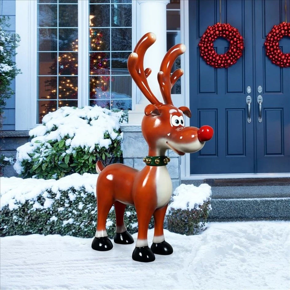 While Rudolph and his reindeer crew are delivering worldwide, Santa’s Second Team is waiting in the wings for their Christmas chance. At nearly five feet tall, our friendly and a bit goofy Jolly Holly reindeer sculpture will make your heart glow leading your holiday decorations. Design Toscano has cast this red-nosed reindeer Christmas statue in quality fiberglass reinforced designer resin, and then hand-painted it one-piece-at-a-time with authenticity from reindeer jingle bells neck bling, to bright red reindeer nose. From your entryway to along side the Christmas tree, this holiday helper is St. Nick’s favorite and always in the mood for festive fun!
