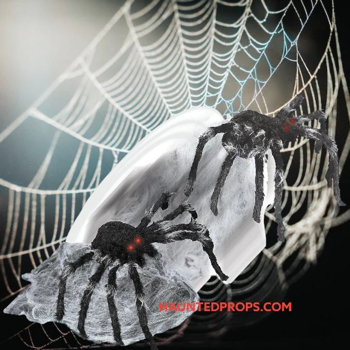 Sleeping spider jumps out of his webbed bed ready to attack! Complete with evil lighted eyes and creepy sounds! Activated by sound motion or footpad. Has lighted eyes and makes scary sounds.Takes 4 AA batteries or one 6v2a adapter.