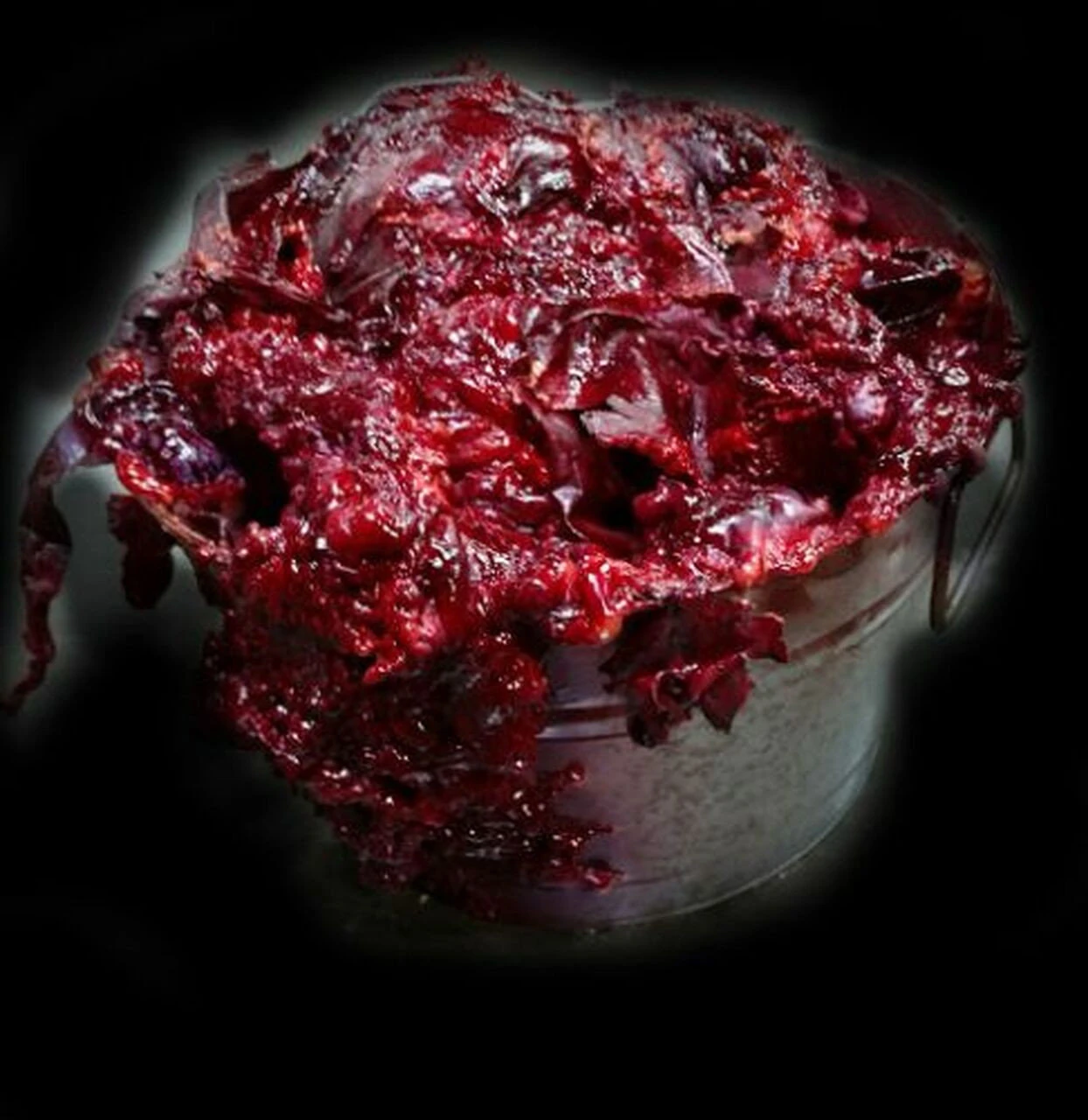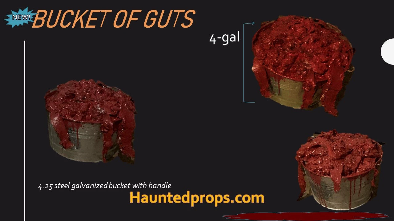 This large 3 gallon real metal bucket has been made to look aged and over filled with guts, blood,flesh and gore