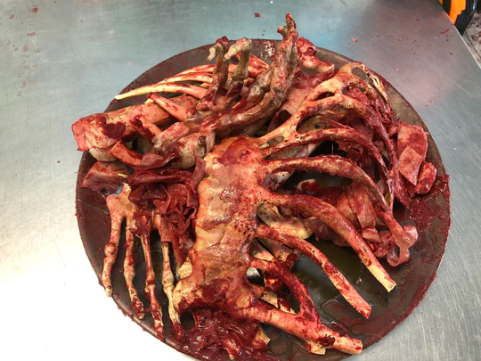 This gory party platter is a great addition to your haunt ,escape room, or film set. Very durable and highly detailed this platter will turn some stomachs. Platters are about 15 inches . Allow 2 to 3 weeks for production .