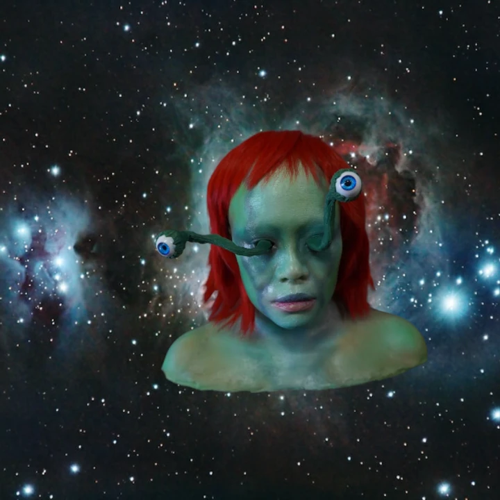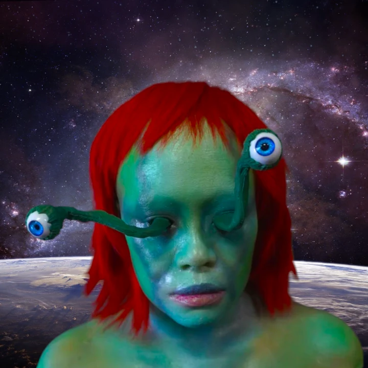 Lifesize green retro alien style female head with red hair and eyes protruding on poseable stalks.