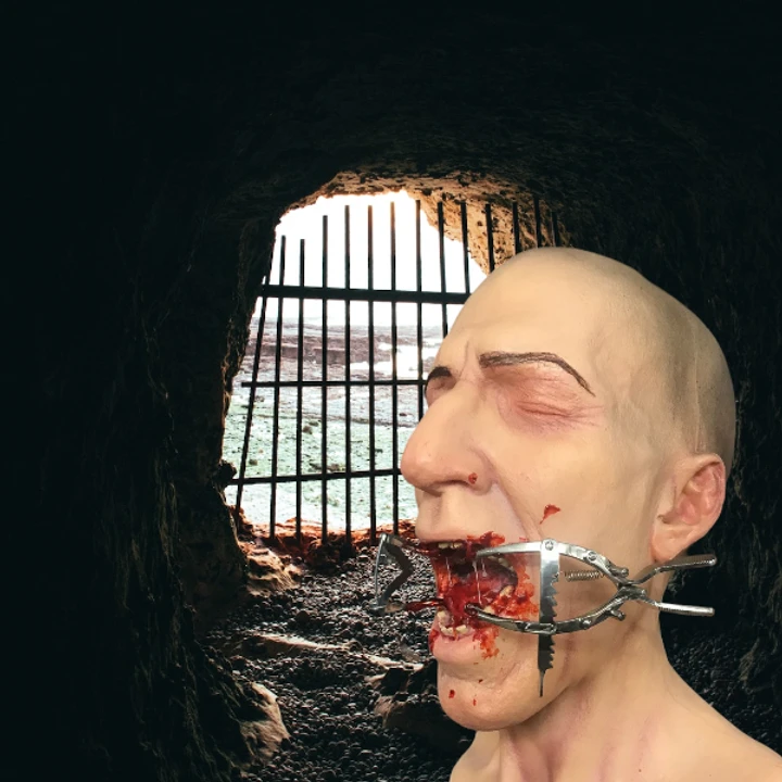 Our classic foam filled urethane rubber, life size Scream head fitted with a ratcheted mouth gag. Removable and adjustable.