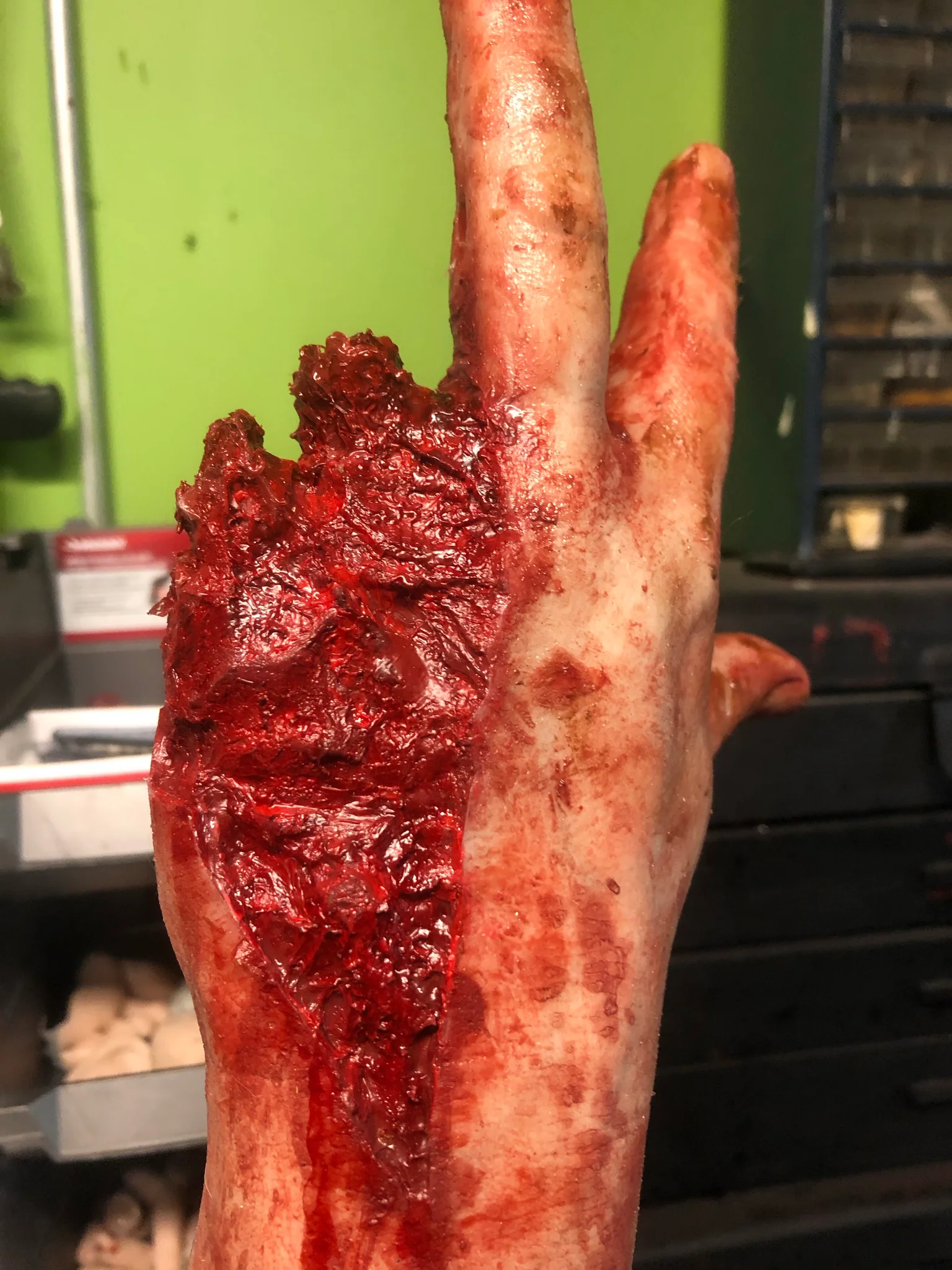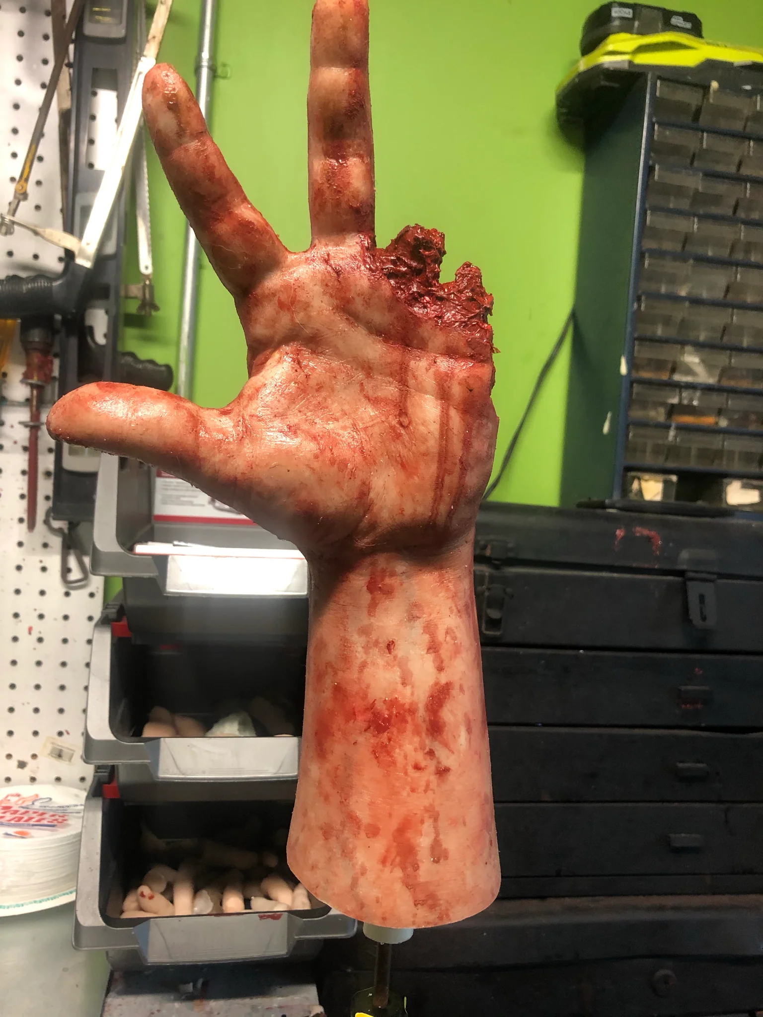 This hand is based off the gunshot wound Michael Myers got during the H40 movie. This arm is 90% solid silicone and is highly detailed pvc piping for mounting optional at no extra cost. These are made to order so each one is unique but similar.