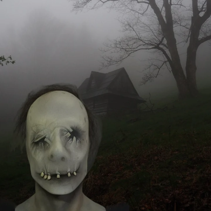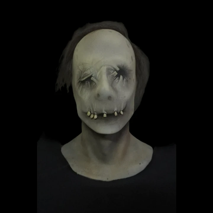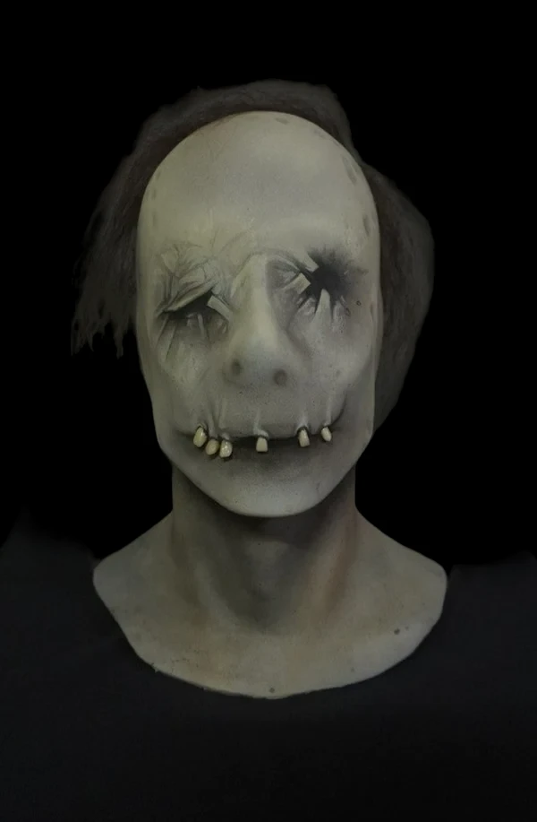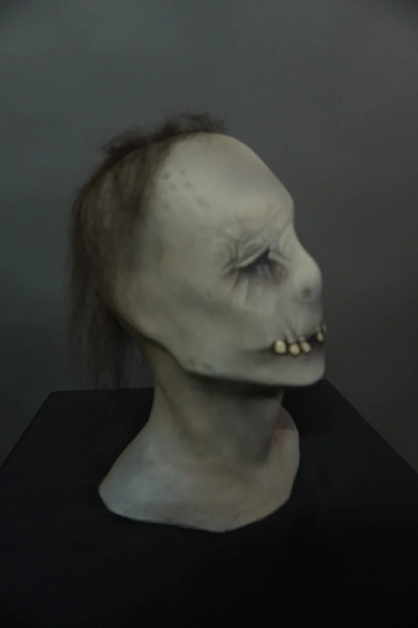 Lifesize nearly formless head a shadowy face and protruding teeth and hair.