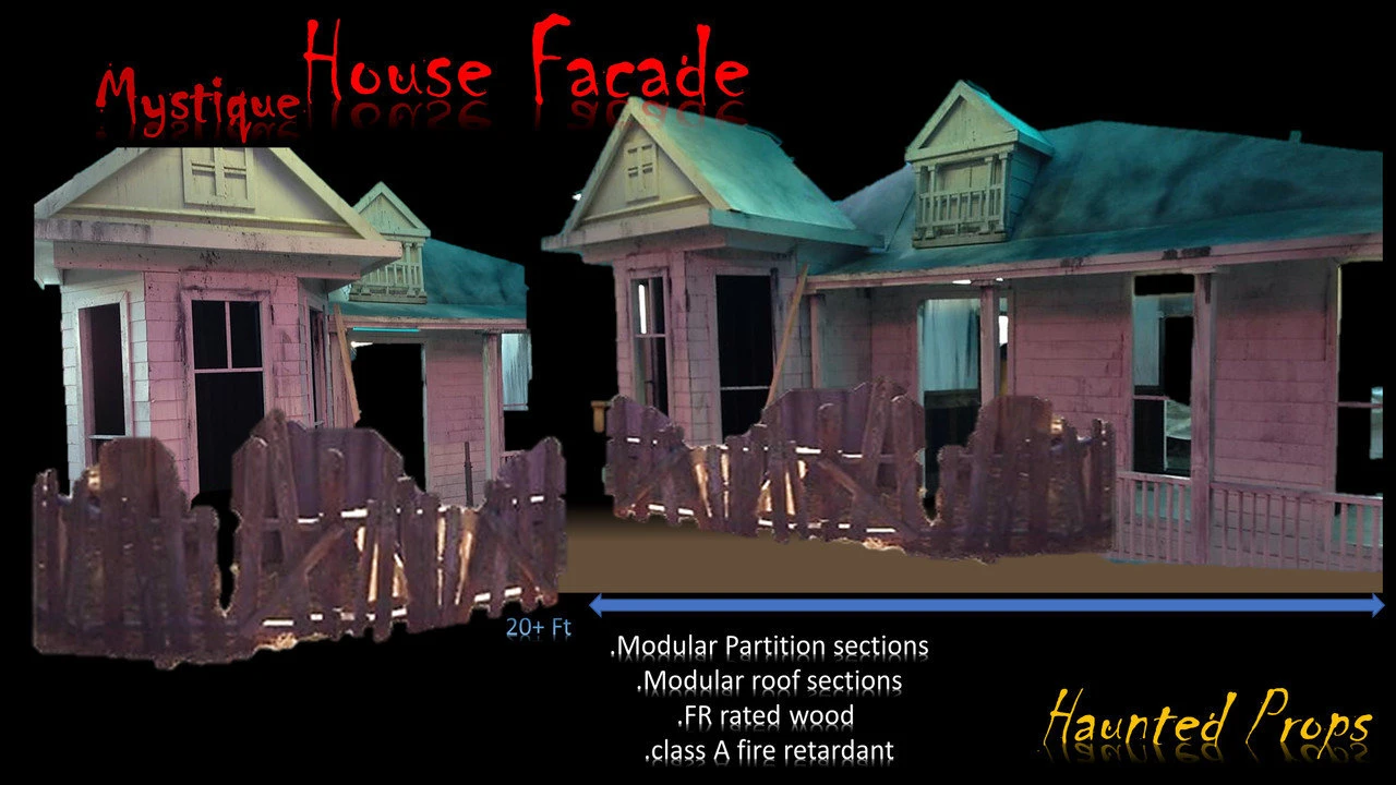 The Mystique House Façade is Full size Uterly convincing House Exterior, Perfect for your any haunted event Entrance or Maze Intermediate Transition, Constructed of FR rated materials , Modular sections, and fencing included