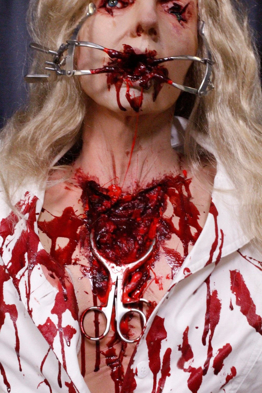 Lifesize freestanding nurse character with a ton of gory details, including bleeding eyes with eye speculum, a bleeding mouth with a ratchet gag and a spreader inserted into a Y-incision in the chest. Perfect for medical or asylum scenes.
