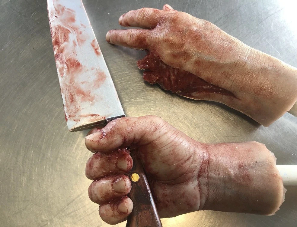 These hands are solid silicone and based on Mike Myers from h40 they can be modified to have all the fingers on the left hand and different a different version of the knife can be substituted. The pics of this listing was a custom order.