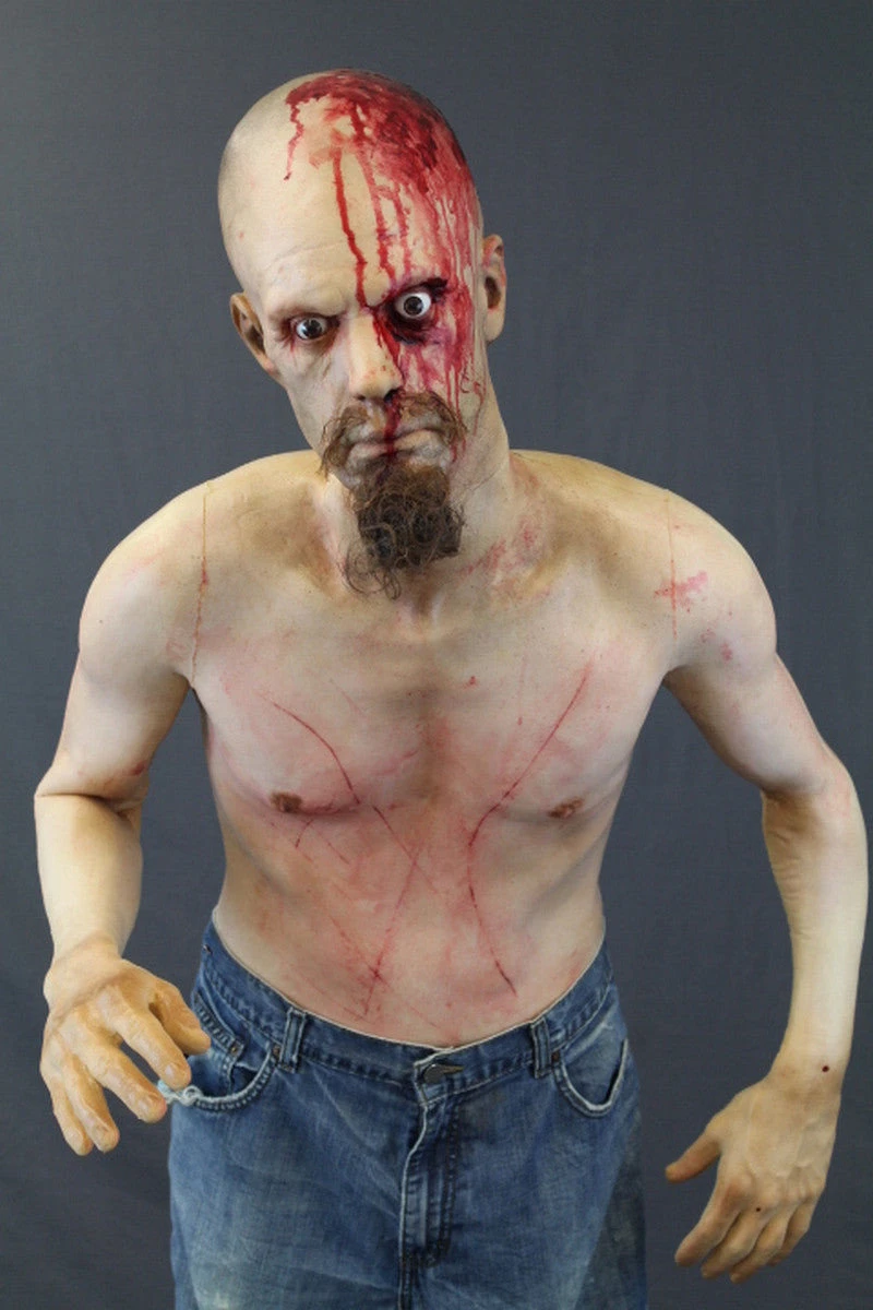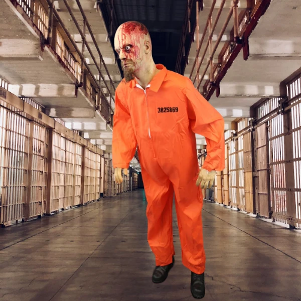 Psycho Frank comes complete with either a slashed up chest and jeans or a orange prison jumpsuit, your choice! 6 ft tall scary looking dude with bug eyes and a killer goatee.