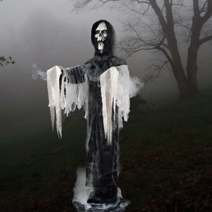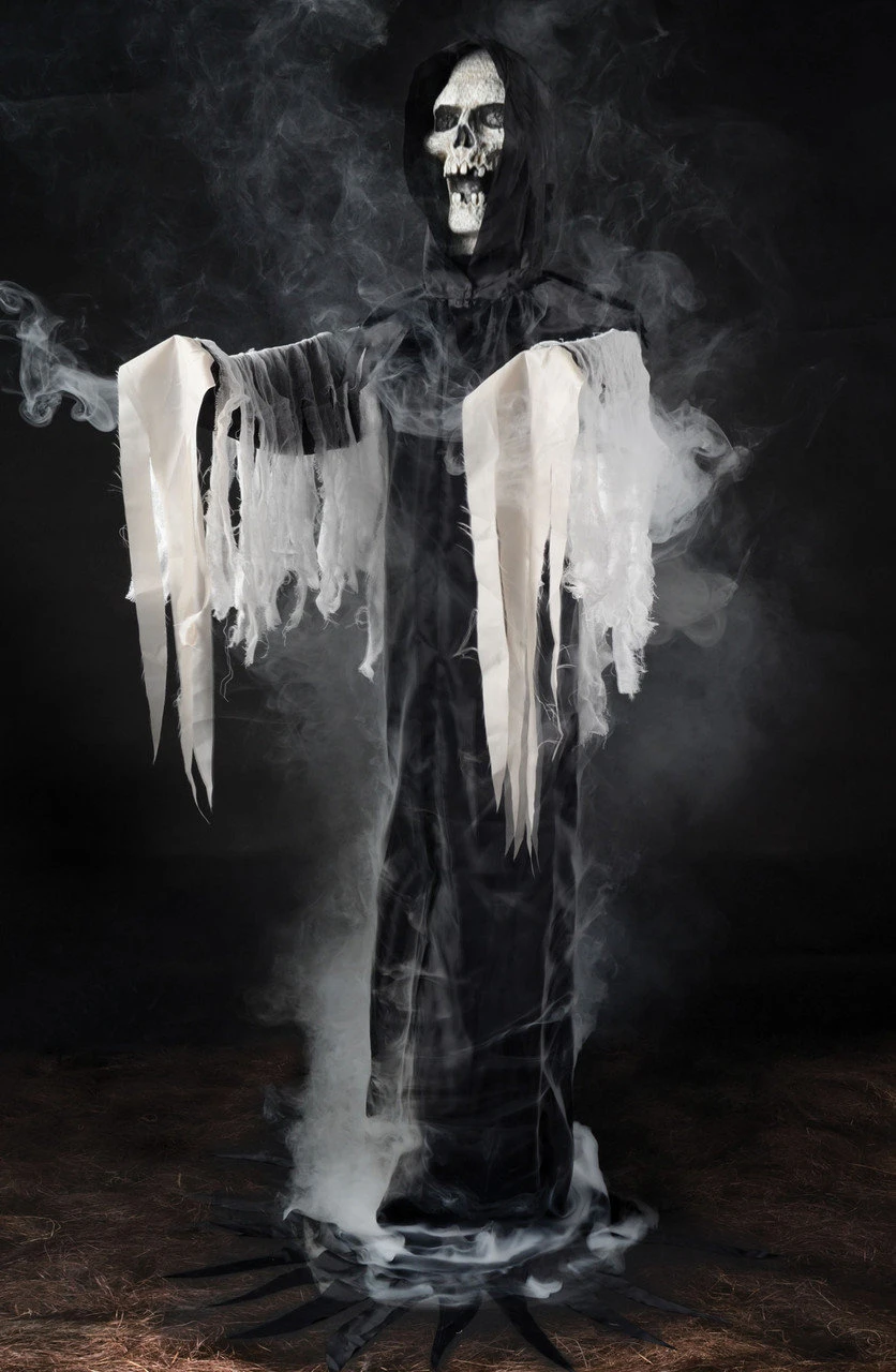 Very spooky looking! The Reaper Fogger Phantom Prop has an Injection frame with posable Wire Arms, tattered fabric Black Robe with white Gauzy Draping Fabric, and a blow molded Face. The Fog Hose and Nozzle are included. Just attach to any of our fog machines for a spooky effect, with fog emanating from the body and hands. The Reaper Fogger Phantom is approximately 58 inches tall with posable wire arms that can extend out to approximately 21 inches. Simple Assembly required.
