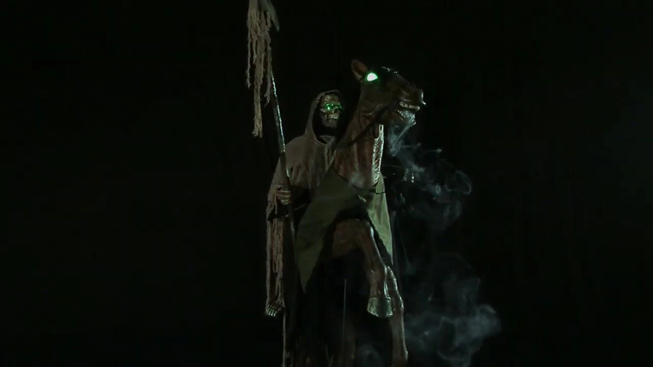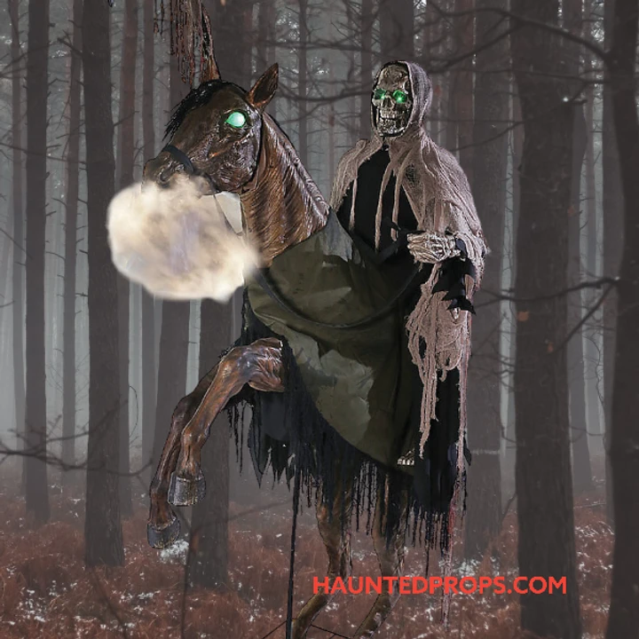 Galloping in from beyond the veil is The Reaper’s Ride Animated Prop. Wearing a black robe with shredded gauze and carrying a long scythe, the Reaper sits atop an eerie steed from the underworld. Once activated, the Reaper’s mouth moves as he says one of six phrases as the horse bucks its head and kicks its front legs. For an added chilling effect, connect the included hose and connection cable to your fog machine (not included) to have fog flow out from the horse’s mouth! Choose from Steady-On, Infra-Red Sensor or Step Here Pad (included) activation options to operate. The infra-red sensor works up to 6.5 feet away and works in all lighting conditions bright light to no light! Item includes volume control. Easy-to-assemble quick-connect poles. Indoor or covered porch use only.