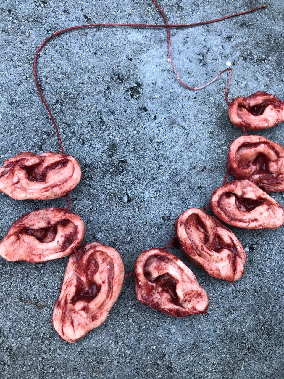 This severed ear necklace is made of 8 silicone highly detailed ears. Length varies and can be customized . If not specified it’s about 20 inches