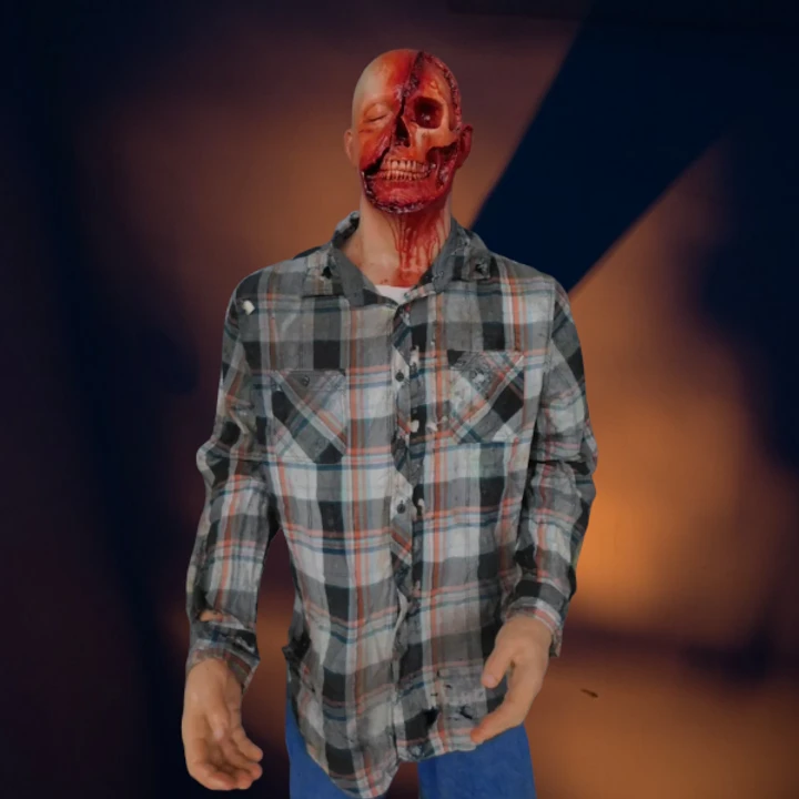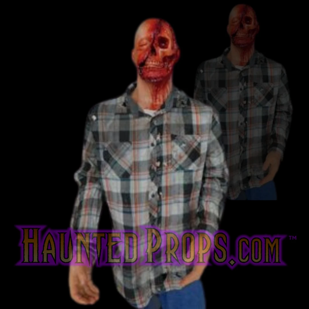 Lifesize standing bloody skull head figure. Features exposed skull with gore. Sculpted and cast polyfoam head and hands on a bloody poseable mannequin body.