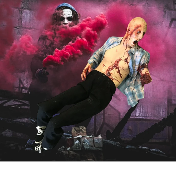 Slashed Floyd Half Anatomical Dummy body features a lifecast upper body with poseable arms and a poseable dummy lower body with poseable waist and knees. Upper body features knife inflicted slash wounds.