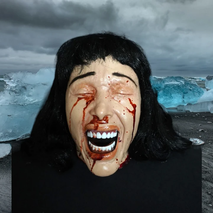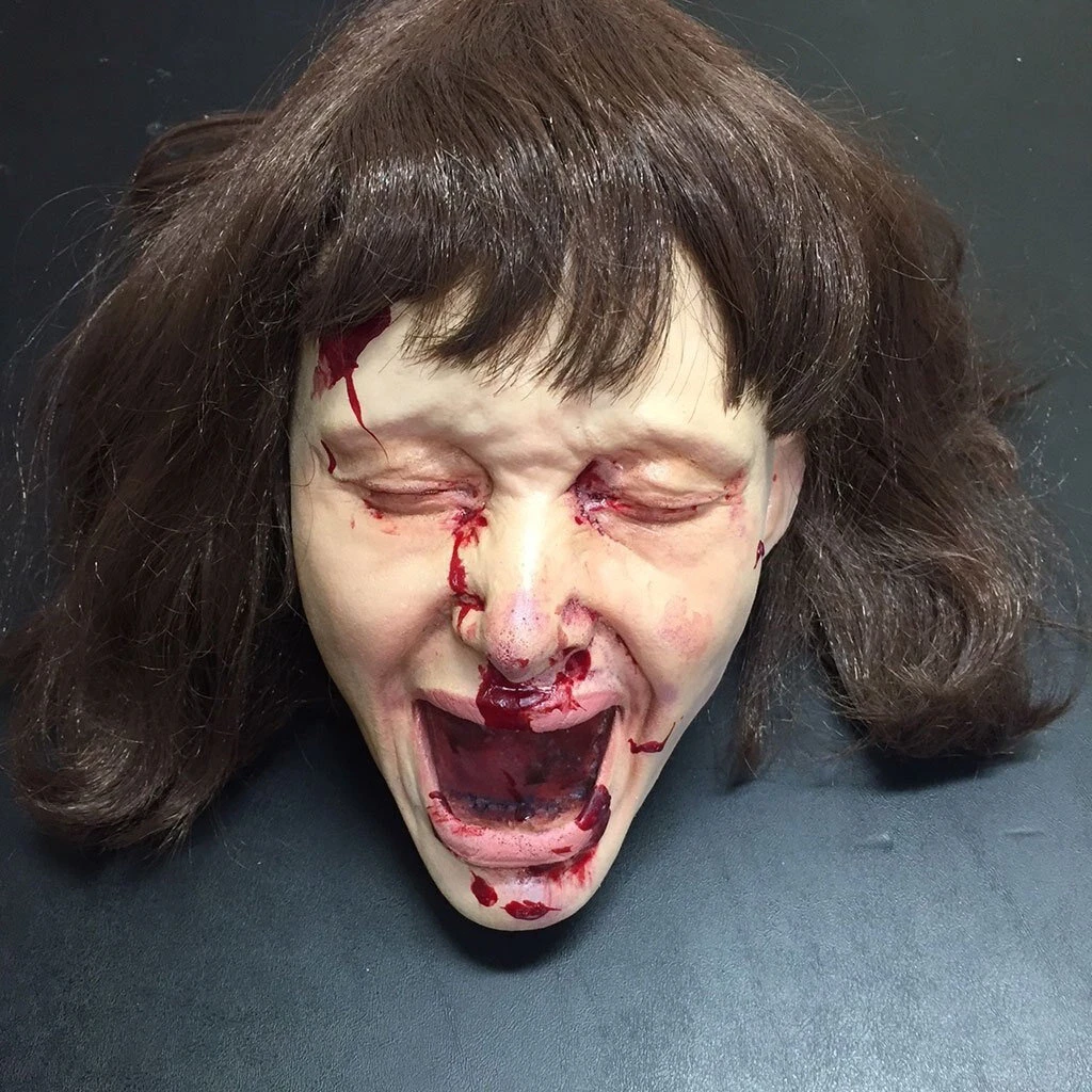 Screaming Agatha severed head prop covered with blood splatters.