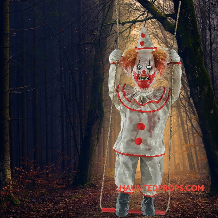 Create a 3-ring fright fest when you bring home the SwingingHappy Homicide Clown Doll! This 39-inch clown prop featuresan infra-red sensor, eerie glowing eyes, and makes spookysounds to all passersby as his head turns side-to-sidewhile he swings back and forth on his swing. Your house willbe a circus of terror with the Swinging Happy Homicide ClownDoll! Choose from Steady-On or Infra-Red Sensor activationoptions to operate. UL power cord included. The infra-redsensor works up to 6.5′ feet away & works in all lightingconditions – bright light to no light! Item includes volumecontrol. Assembly required. Made of polyester, PVC, sponge,plastic, hemp rope, electronics. Hang from any pipe.Including the swing mechanism, rope and figure, total lengthis 46 inches.