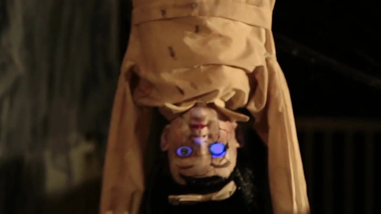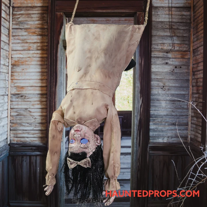 The Swinging Head First Doll animated prop features a littlegirl doll hanging by her legs on a swing with hollowed-outeyes that glow an other-worldly blue, and speaks hauntingphrases to all passersby as she swings back and forth.Choose from Steady-On or Infra-Red Sensor activation optionsto operate. The infra-red sensor works up to 6.5 feet awayand works in all lighting conditions - bright light to nolight! Item includes volume control. UL power cord included.Assembly is required. Materials: polyester, PVC, sponge,plastic, hemp rope, electronics.