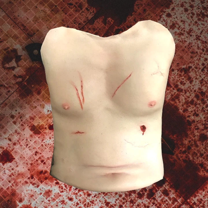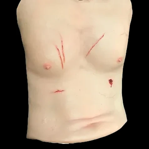 This sheet of “human skin” is made from poly urethane and is about 18 inches wide by 22 inches long. Chain hanging armature optional. Includes the following traumas: Lacerations x 4, scars x 3, gunshots x 1.