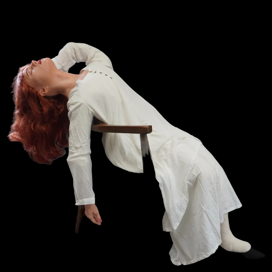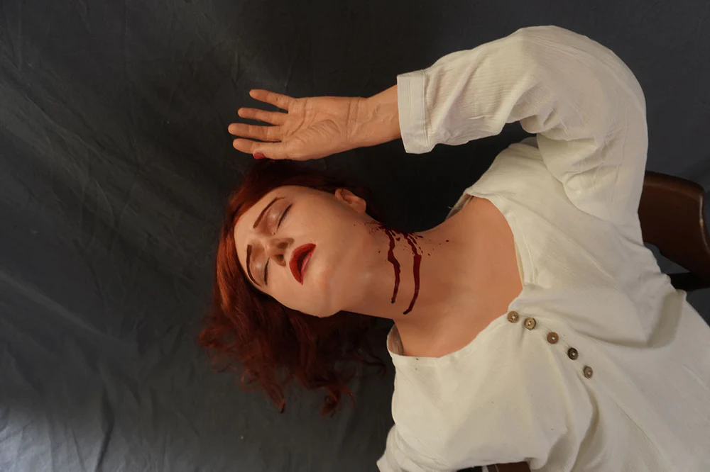 Poseable canvas body with lifecast female Phoebe head and wig. Vampire victim bite wounds on an outstretched neck.
