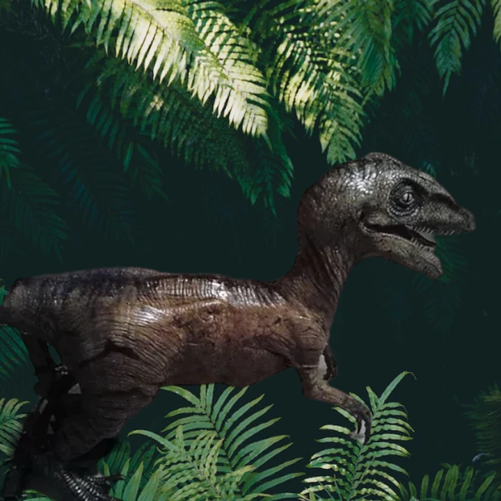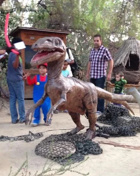Static display velociraptor, made of polyurethane flex foam and slip casting latex, Extquistily airbrushed with exagerated texture and scales. glass eyes and gloss medium finishes. 106″ length x 60″ height 20″ wide. complete.