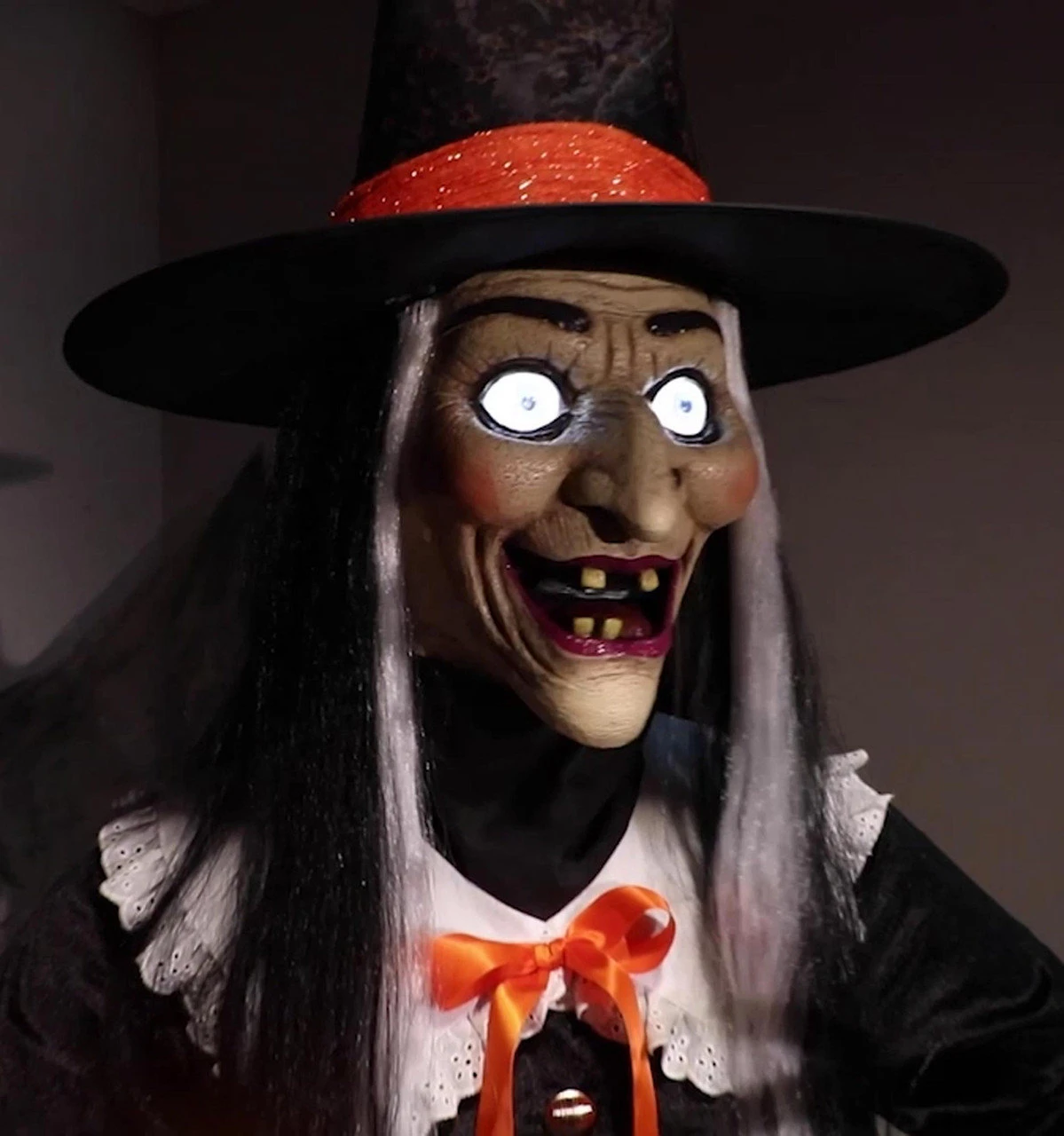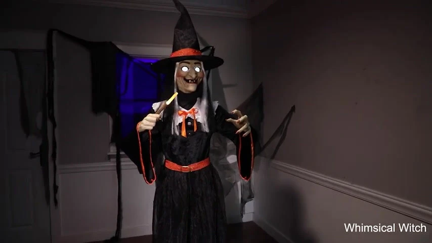 Invite this fun-loving Whimsical Witch Animated Prop to your next Halloween party! Have a good laugh with her while her Head and Torso turn side to side, her Jaw Moves as she speaks, and LEDs Light-Up her Eyes and Wand. Her long Black Dress has Orange details and a wide White Collar with a ruffled trim. Her matching Tall Witch Hat has a pretty glittery orange band. She only casts whimsical spells this Halloween season to make sure you and your guest have a wicked fun celebration.